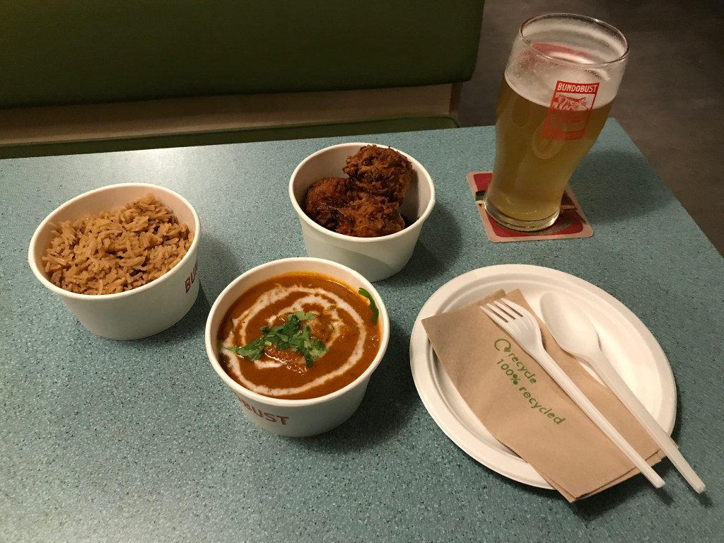The food arrived a little longer than my self-restraint could hold out so the head had been taken off my beer before I took the photograph! Who says that plant-based food can’t look spectacular, even when served in utilitarian containers. This was a feast for both the taste buds and the eyes, and that is before I discovered the hidden elements.