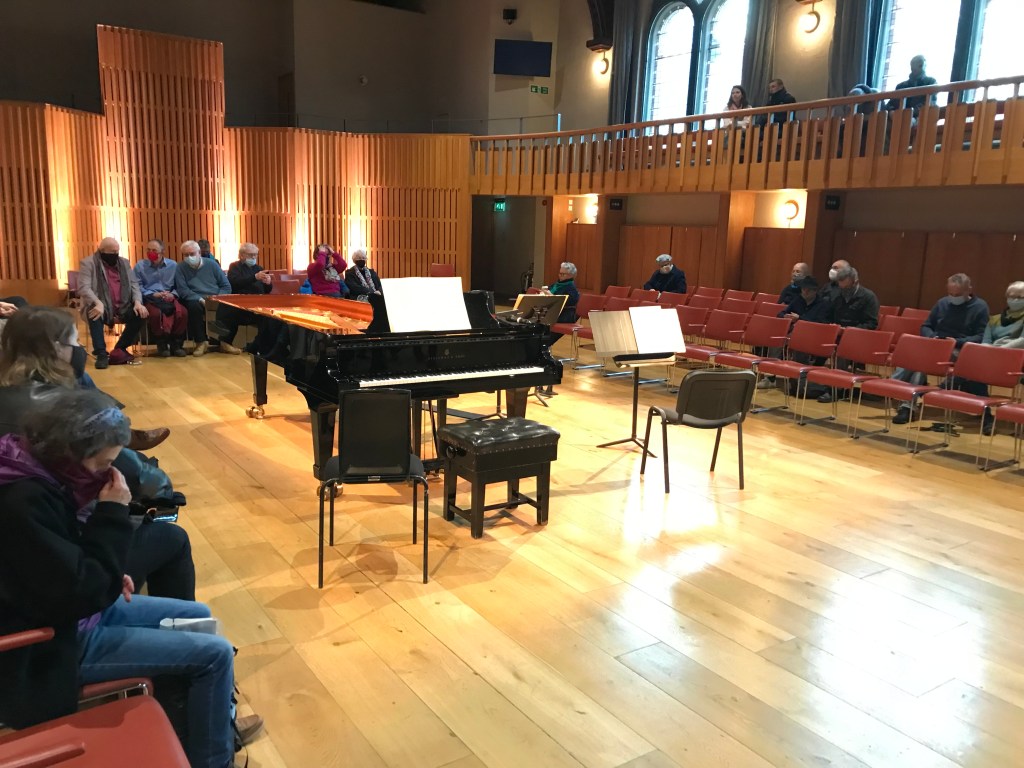 When I entered the wonderfully versatile Howard Assembly Room I saw that it had been set out not ‘in the round’ as such, more ‘in the rectangle’. The flat edge of the magnificent Steinway grand piano was on one side with the seats for the clarinetist, cellist and violinist nestled in its curve. There were three or four rows of seats on each of the four sides as well as those in the balcony.