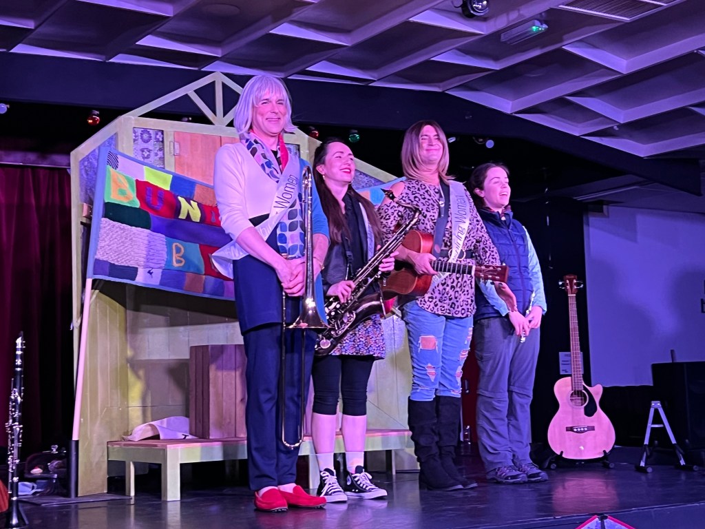 Anyway, back at the club, I arrived unfashionably early, as is my want, and was told by an extremely pleasant woman that the concert room was not yet open but the bar was, so I decided to partake of a pint of hand-pulled ale before the show. I had just deposited a handful of peanuts into my ample gob – I do like to dine out on a Saturday night – when I was approached by two of the cast members from the show, Alice McKenna and James McLean, bearing a goody bag containing literature pertaining to the company and a container of hand sanitiser, which I made a mental note not to mistake for gin on the bus home! The conversation was a bit one-sided as, when I ventured to speak I sandblasted the listener with dry roasted KP. I was also somewhat taken aback by the appearance of Mr McLean in long blonde wig, full make-up and dressed in a Mary Quant Mondrian pattern trouser suit. I have seen enough drag acts lately not to have been fazed, but it turns out that I had got the wrong end of the lipstick. When the show began it hit me that it was about Women’s Institutes and the company comprised two men and two women, so the chaps were in character for the evening, and a brilliant job they made of it too.