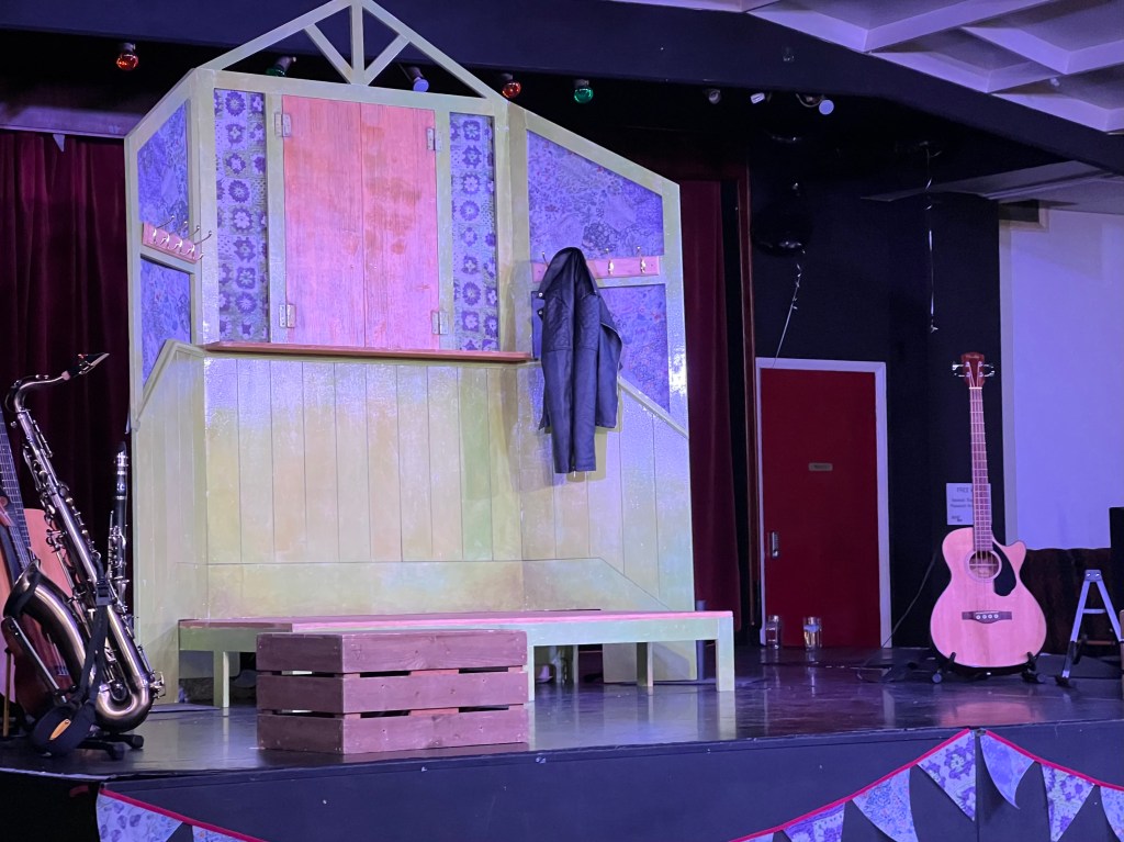 The set was small and sparse, as it needs to be if carried in the confined space of a narrow boat. It comprised the interior wall of a village hall with serving hatch which would unexpectedly open to reveal a cast member with sometimes a rabbit or trombone!