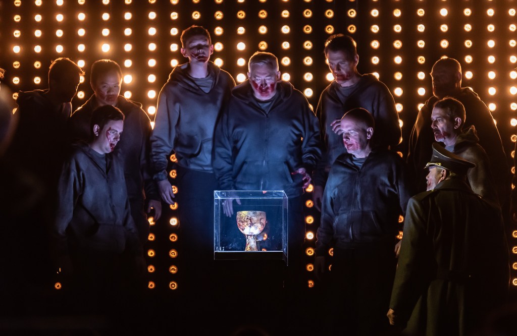 In keeping with a work centred on myth and legend, there was a great deal of symbolism involved in its staging. Colour was a big factor with most of the knights and esquires wearing grey, the kings in military uniforms, the Flowermaidens, whose job was to pander to the whims of Klingsor’s knights, were in red, echoing those worn by the women in The Handmaid’s Tale. Klingsor was dressed in a uniform of grey and red which I took to reflect his ambiguous condition. Kundry wore blue and Parsifal a white shirt covered in the blood of the swan he had killed. Yes, he was the mystery pure fool.