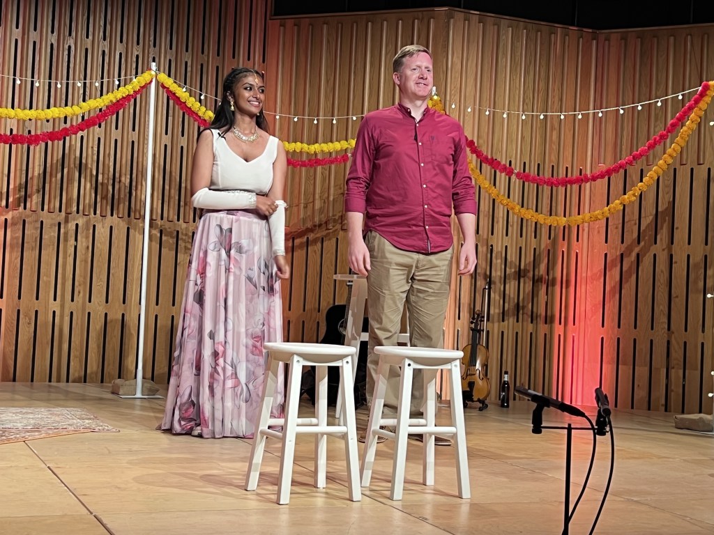 It is a joint effort between Opera North and South Asian Arts-UK, with a mash-up of Scottish folk music, South Asian songs and jazz thrown in for good measure. As a rule I am not a great fan of opera singers who try to break out from their own discipline, but the brilliant Nicholas Watts, who is a mainstay of these pop-up events, gets it just right, I was surprised to see that he is no slouch on the violin either. He played Orpheus, with the incredible Ashnaa Sasikaran as Eurydice. I don’t mean to be shallow (I don’t mean to be, I just am!) but not only is she a wonderful singer but devastatingly beautiful as well. If only I were 50 years younger – she probably still wouldn’t want anything to do with me.
