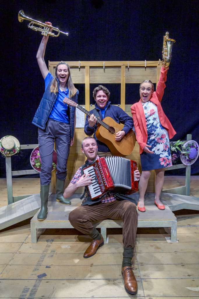 The cast showing their musical skills. Harvey Badger – guitar, Hannah Baker – trumpet, Eddie Ahrens – accordion and Rachel Hammond – saxophone.