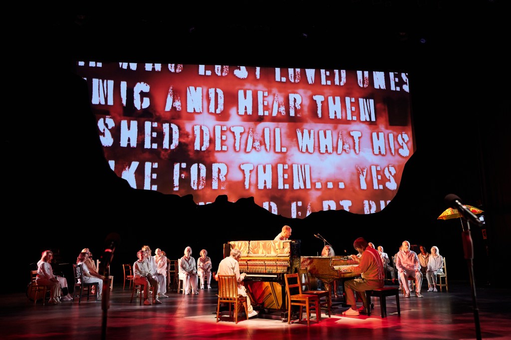 Sinfonia is the centrepiece of a project between The Performance Ensemble, Leeds Playhouse, Leeds Museums and Galleries and Leeds Older People’s Forum for LEEDS 2023, under the umbrella title of 1001 Stories. Leeds Playhouse has surrendered their premises from 24th April – 6th May to the above to facilitate a series of productions from those of advancing years. It made a refreshing change to be in the audience watching a cast, the members of which were all about the same age as me, with some even a little older.