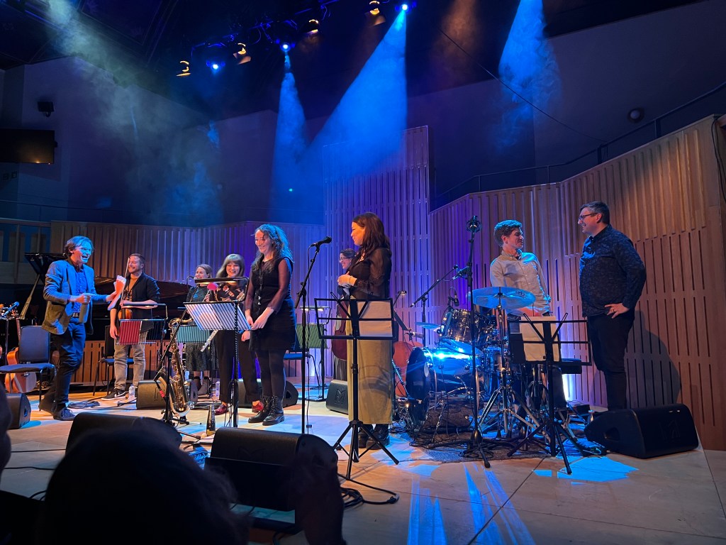 So, it was on to the main event and a total change of mood, with the stage now occupied by Sarah Hayes on piano and flute, not at the same time I hasten to add, Faye MacCalman on saxophone and clarinet, again one at a time, John Pope on double bass, with Peter Brewis, David’s brother, on drums. In addition to the core ensemble there were strings, The Crude Tarmac Quartet, who obviously spend most of their time on the road, and vocals from Eve Cole.
