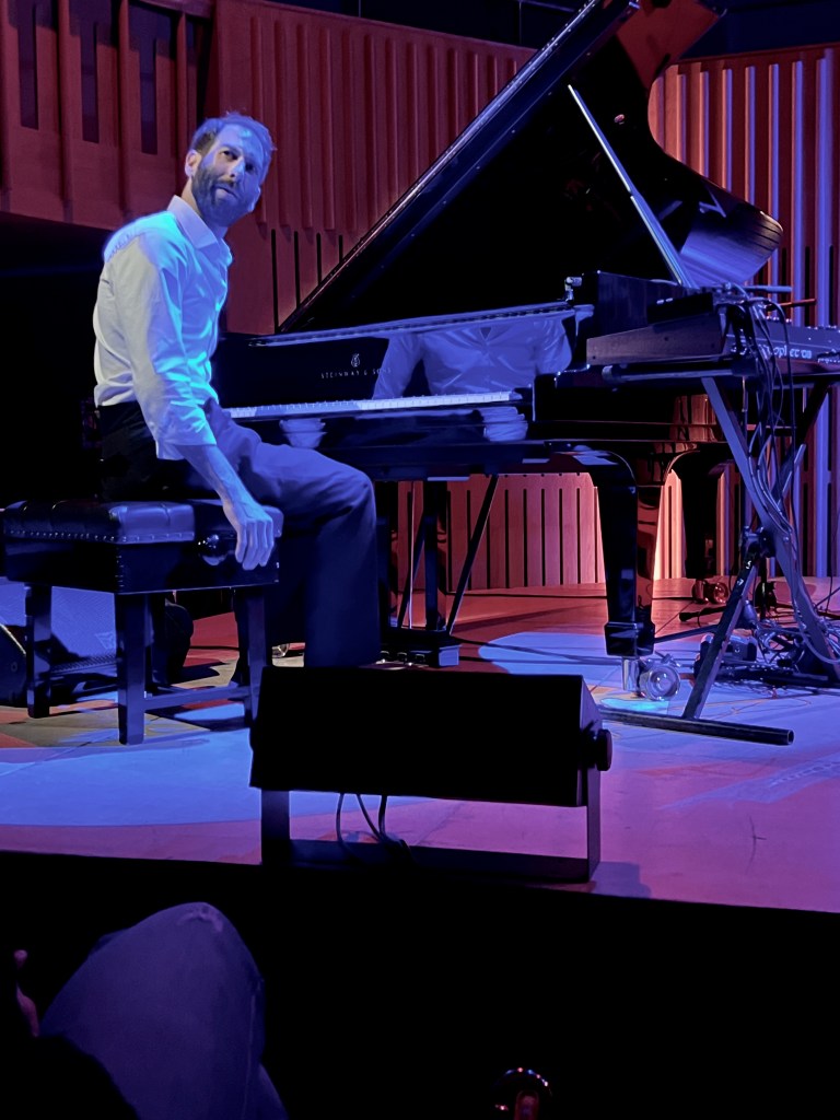 I couldn’t work out whether he was doing an improvised set as his hands would hover over the keyboard for a few seconds but, instead on dropping them vertically onto the ivories, he would make a sideways shift and hit a different part of the instrument. Speaking of hitting the piano he even struck the wooden piece at the end of the keys as well as hitting the fascia of it. He also leaned over the front and plucked the strings direct. I was obviously not on my own in being confused by his work as, because of the long periods of silence in some of the works, he had to more or less signal to the audience when he had reached the end of each piece.