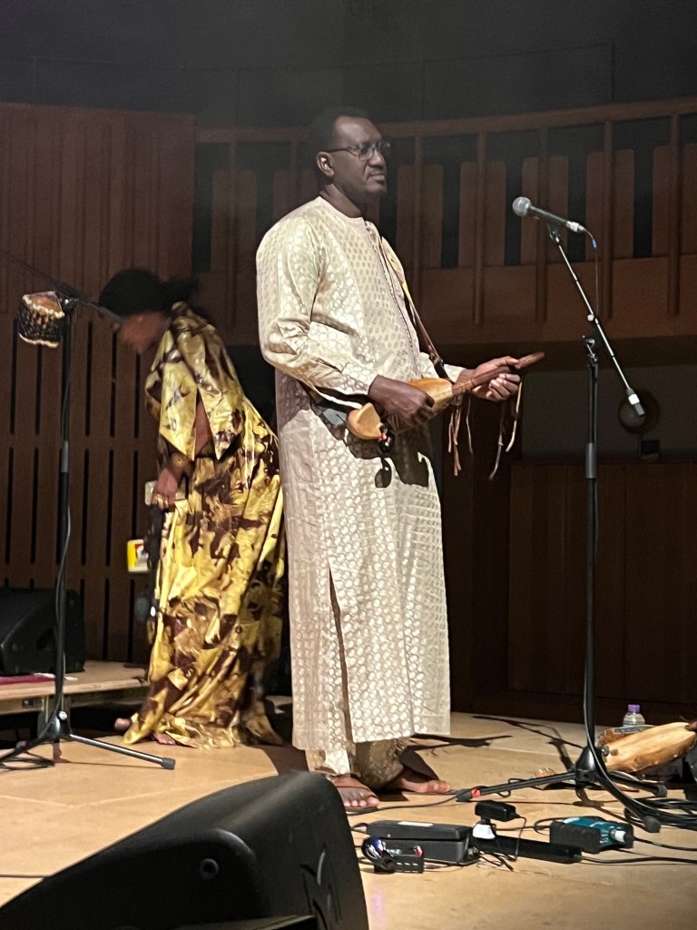 Mahamadou Tounkara with yabara and talking drum ready for action