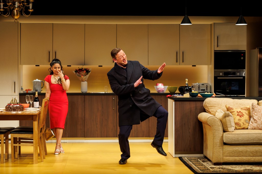 As with all birthdays there has to be a cake, the collection of which has been delegated to Nav who has forgotten to pick it up and the shop from which it has been ordered has closed. This is just the first of many incidents which trigger family bickering and skeletons being dragged from closets. None compares with the one of dinosaur proportions exposed by the introduction of a family outsider, Maurice, played by Kieron Crook, right at the end of the first half.