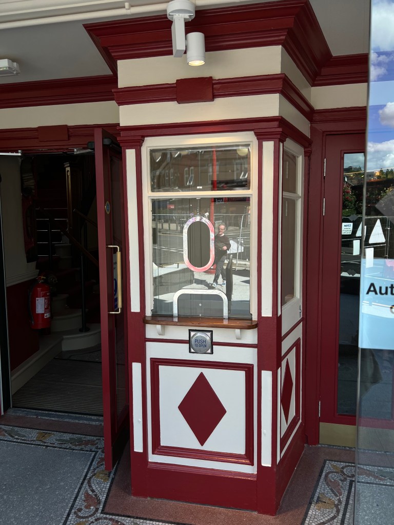 There are also features which have been kept just for their own sake, and to add to the ambience, such as the emergency fire hose, but don’t worry, there are modern extinguishers for use if required, and the original ticket booth outside where we used to have to queue in the open air, i.e. rain, to get in. Thankfully a new box office has been installed in the fabulous restored foyer making the wait a lot more pleasant.