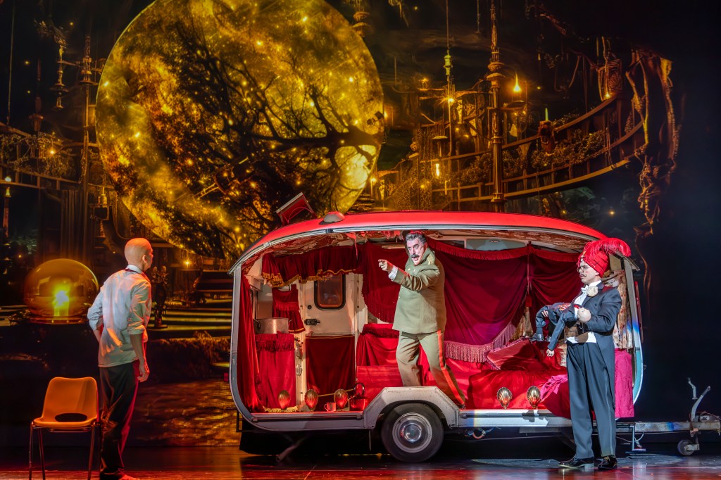 Andri Björn Róbertsson as Nebulous, Xavier Hetherington as Scrofulous and Matthew Brook as Sceptic with members of the Chorus of Opera North