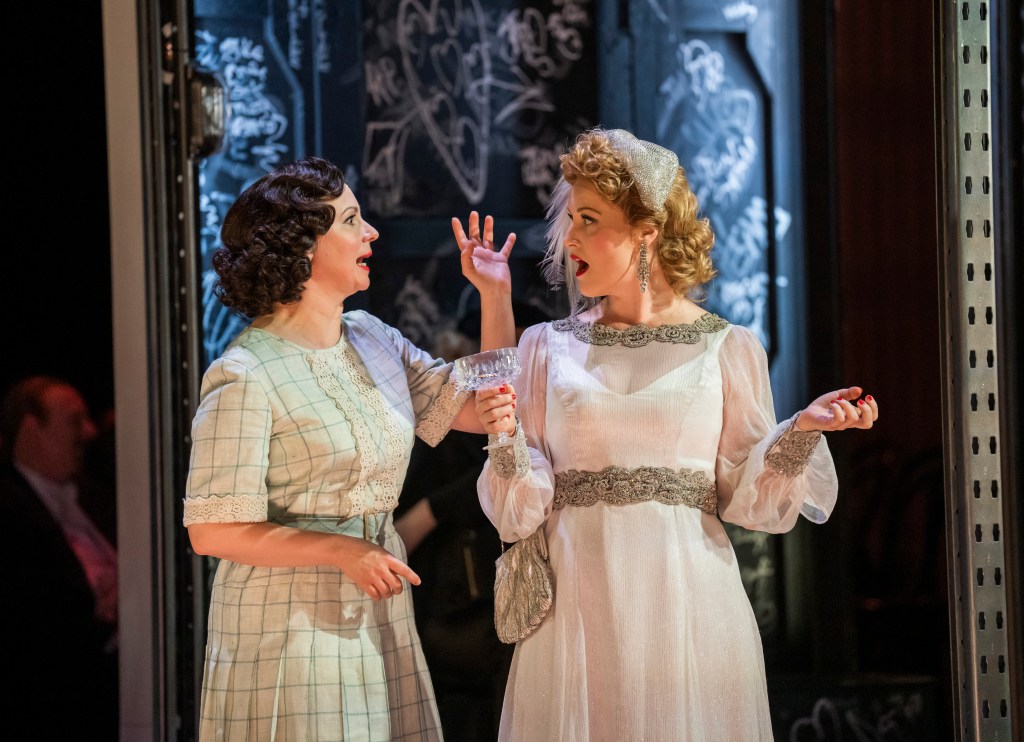 Something else which worked brilliantly was the humour. It was not farcical, as can be the case in this genre, but quite subtle. When the ladies are emptying the drinks trolley and all that is left is a pale blue liquid, one of them pours out a round and, holding the bottle to sniff the contents, grimaces at the odour, but then shrugs her shoulders and downs it regardless. I also couldn’t help but smile when Lisette, sung by Clair Lees, dressed in archetypal French maid’s costume, was pushing the trolley, as she looked like a cross between a Lyons’ Corner House ‘Nippy’ (google it you young ‘uns) and Julie Walters in the famous Victoria Wood sketch in a cafe. You had probably better google that as well!