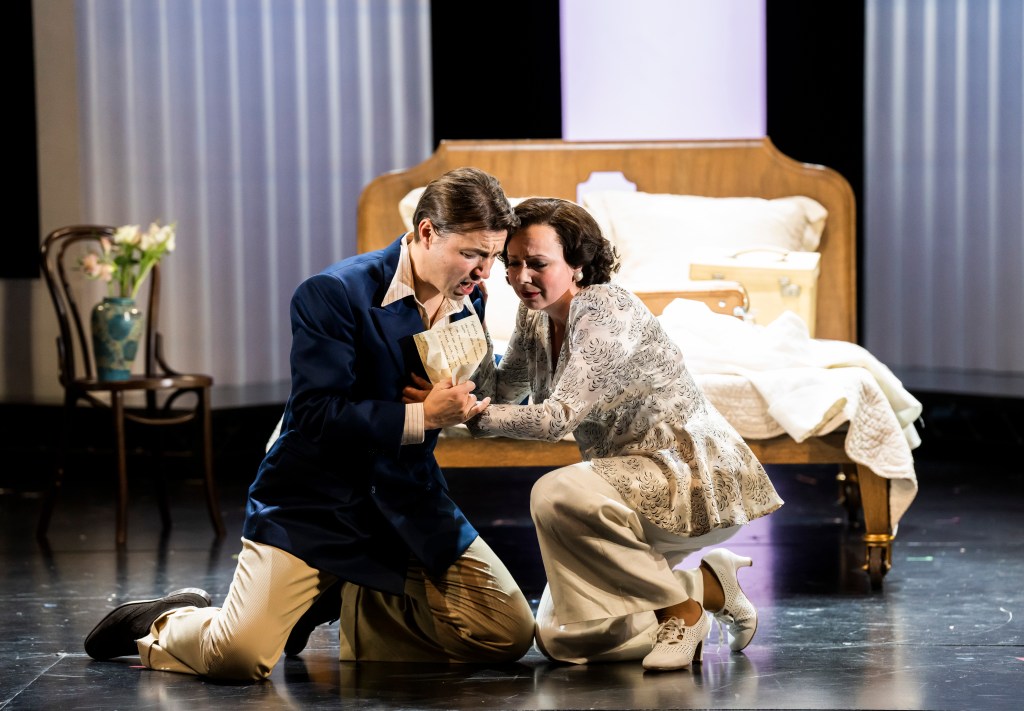 The one comedic example which I believe was unplanned, but if so was superbly covered up by Galina Averina, as Magda, was when she was leaving Ruggero, Sébastien Guèze. She had packed and put her suitcase on the bed before leaving him at the end, but when she picked it up the lid opened and her clothes fell out. She rapidly replaced them and strode out without missing a beat. If it was accidental, it fit perfectly into the plot. How many times have we wanted to maintain an air of dignity in a crucial moment only to be embarrassed by an inanimate object, such as a spilled tea cup, a pen which wouldn’t work or pushed a door which should have been pulled or slid.