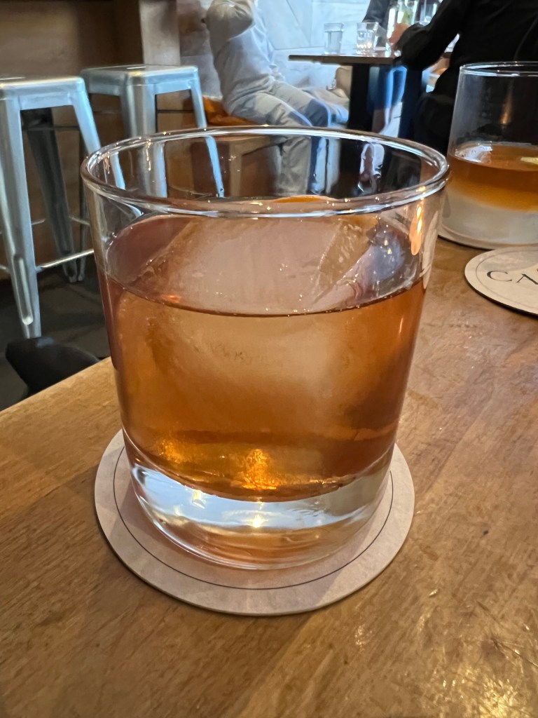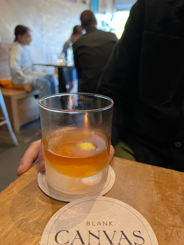 The taste was as good as I have ever had with the sweetness of the sugar and fruitiness of Orange Spritz not compromising the overall dry taste, enhanced by the bitters. As with Blank Canvas, the spirits are of the more upmarket brands, the Bourbon being Woodford Reserve. I thought that they had given me a double measure until I saw that the ice cube was similar in size to the one which put paid to the maiden voyage of the Titanic. This was a good thing because it means that the coolant dissolves a lot slower than would be the case with a couple of smaller pieces or, Heaven forfend, crushed ice, thus allowing the drinker to regulate how diluted they want their libation to be. Needless to say I took care to make sure that not too much water was allowed to permeate the ingredients by quaffing the drink before damage could be done.