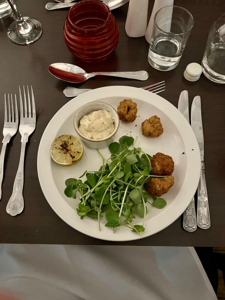 I had ordered the Salt and Pepper Fried Squid with Chimichurri Dipping Sauce for main course, as had my friend with whom I was sharing the wine. He likes Squid but is not partial to spicy food so asked that the sauce be replaced with mayonnaise, which, to their credit, is what happened. He might as well not have bothered as the dipping sauce was very light on the red chilli flakes so hardly hotter than his mayo. The squid was fairly bland as well. The point of searing a lime is to serve it while still hot to add a caramelised flavour to the juice, this was stone cold.