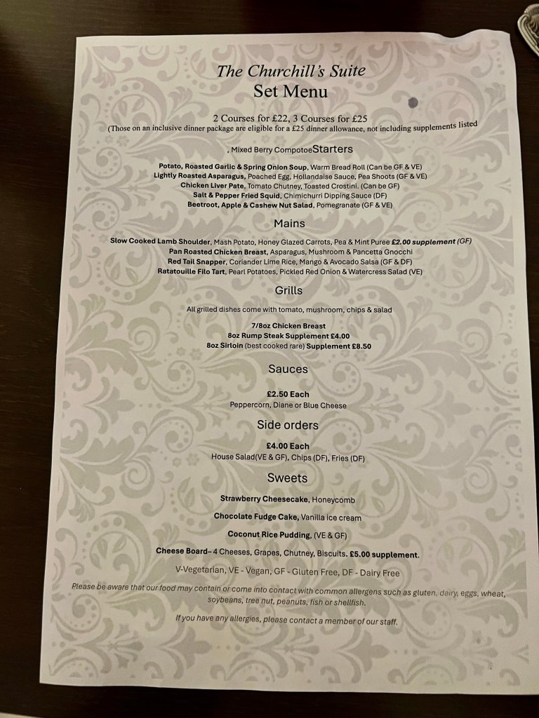 The menu itself seemed to encapsulate the lax attitude of the whole experience. Note the glaring mistake in the Starters field and a couple of other possible typos; Mash Potato – certainly and Mushroom – possibly. I thought that there would be more than one mushroom served but I was later to find out that possibly there wasn’t. By the way, the room is The Churchill Suite, no apostrophe s.