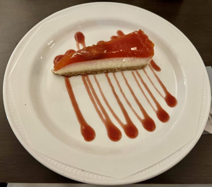I can only presume that the honeycomb is incorporated into the base, although the taste was not discernible. The comma after Cheesecake on the menu would imply a separate item in a list, but I had given up by this time. The lady diner’s Chocolate Fudge Cake, Vanilla Ice Cream certainly didn’t have the latter component incorporated into the former, nor anywhere else on the plate for that matter.