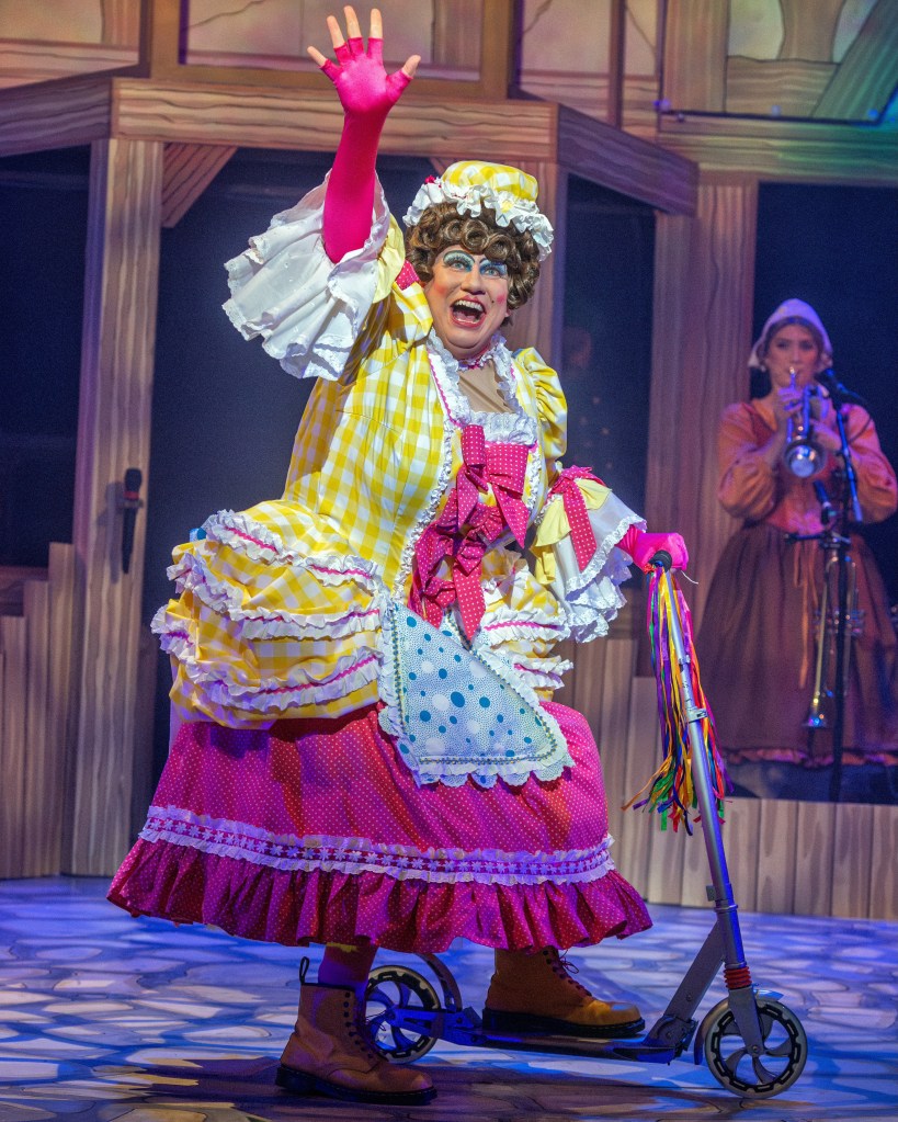 After the scene-setting poem from Fairy Aubergine, who must be vegan as she has a leek for a magic wand, the action began. The villain, Fleshcreep, played by Kenny Davies, entered to a rousing welcome of booing. Followed by the cheers for Jack, Harry F Brown, Jill, Lucy Ireland and Dame Dolly, who is always the lynchpin of the piece, played, superbly as ever, by Simon Nock, in a range of outrageous costumes. During her initial banter Dame Dolly informed us that her son was marrying the daughter of Squire Snuffbox so she will be entering the aristocracy, which will be a change as it is usually the other way round, one for the adults there, as were the references to Fairy Aubergine and her emoji. The children were entertained by plenty of poo jokes and a copious amount of farting. The slapstick was expertly executed, mainly by Billy Nomates, Guy Freeman, and Squire Snuffbox, Dan Carter-Hope. The Giant, Tim Robert, was completely enveloped by his costume but he still gave his character plenty of – well – character. For some reason his wife, played by Stephanie Cremona, had a broad Scots accent, although looking at her brief bio in the digital programme, her previous work has been at Dundee Rep, so that could be a clue.