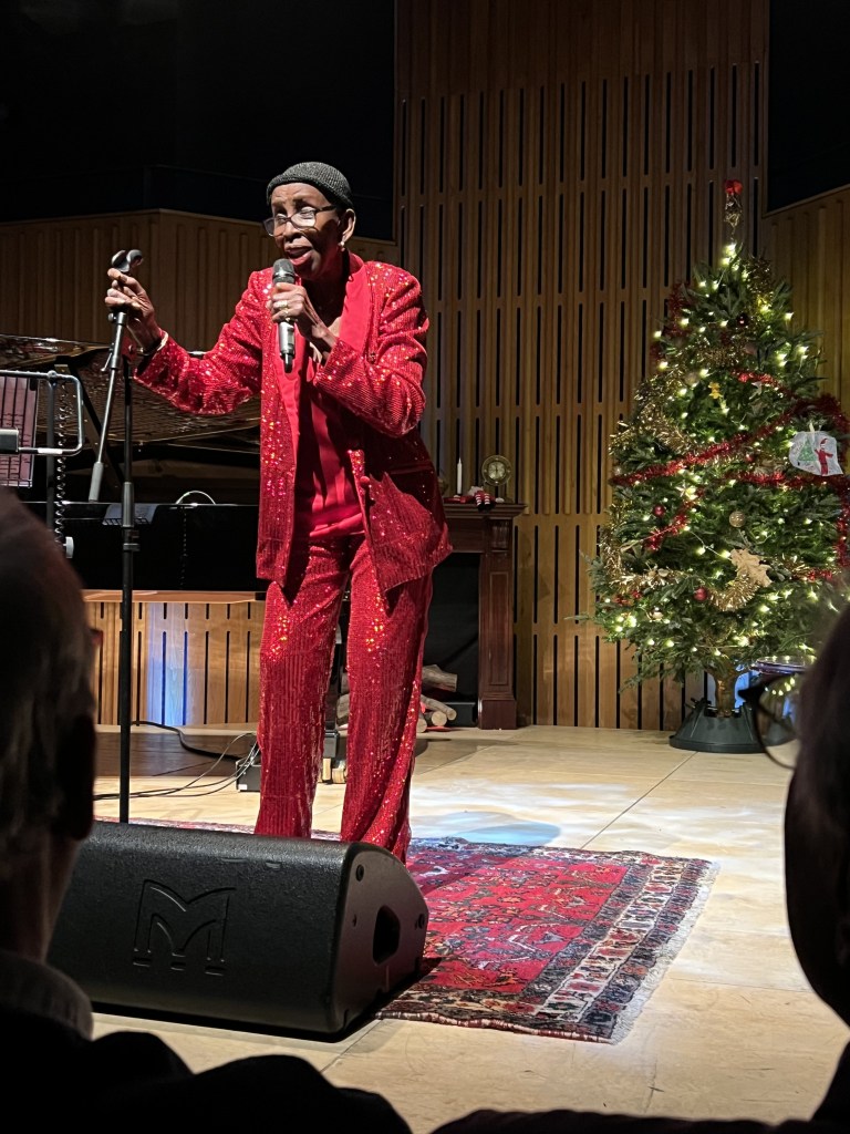 Speaking of music, yes, there were songs as well, they kicked off with The Most Wonderful Time of the Year, which I must admit, had me a bit worried as she had to don her specs and read the words from a cheat sheet, but I needn’t have worried as the rest were done from memory. Another seasonal classic was Santa Claus is Coming To Town. Being dressed in a red glitter suit, she added that he wasn’t coming to hand out presents, but to get his jacket back.