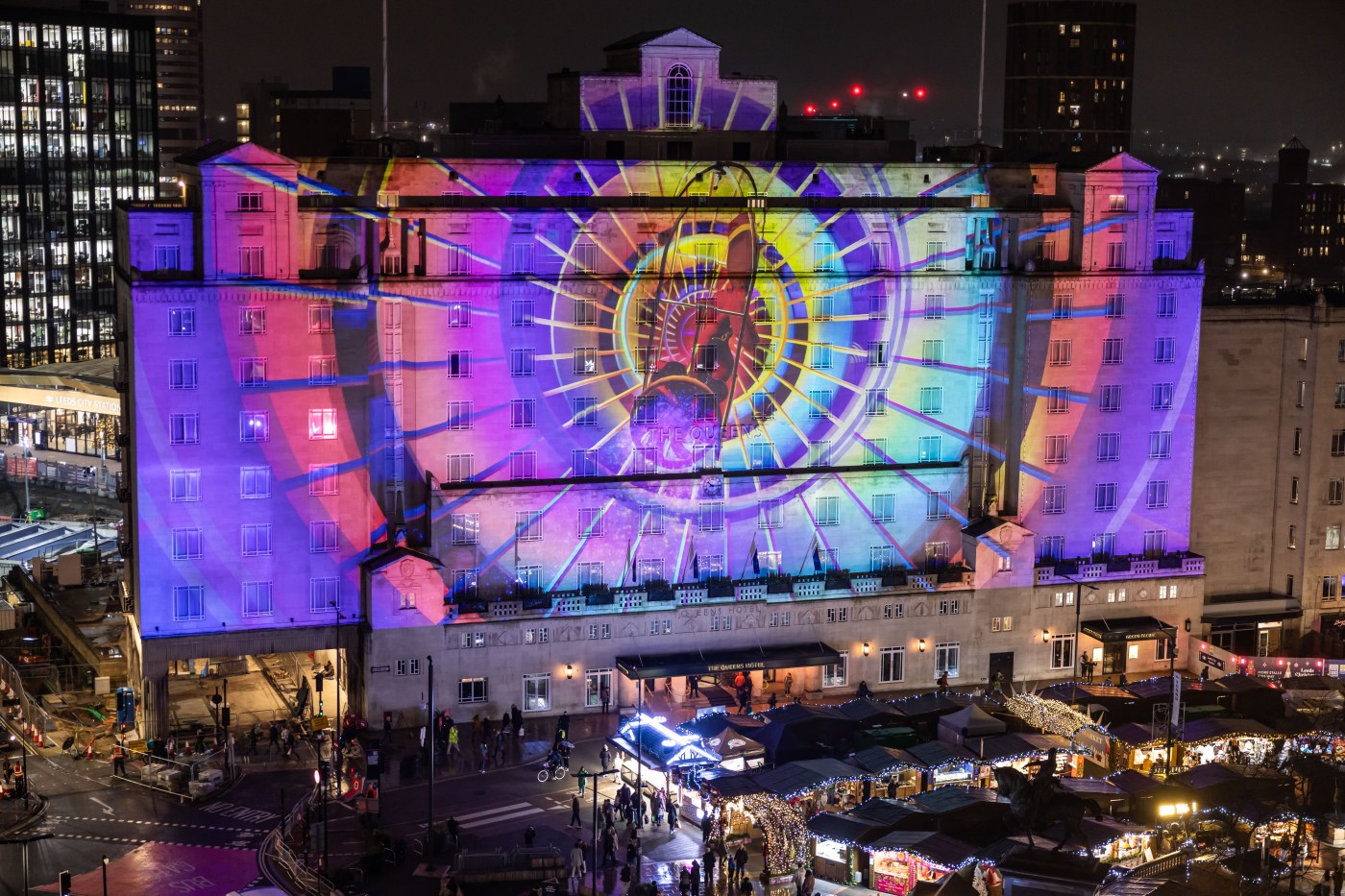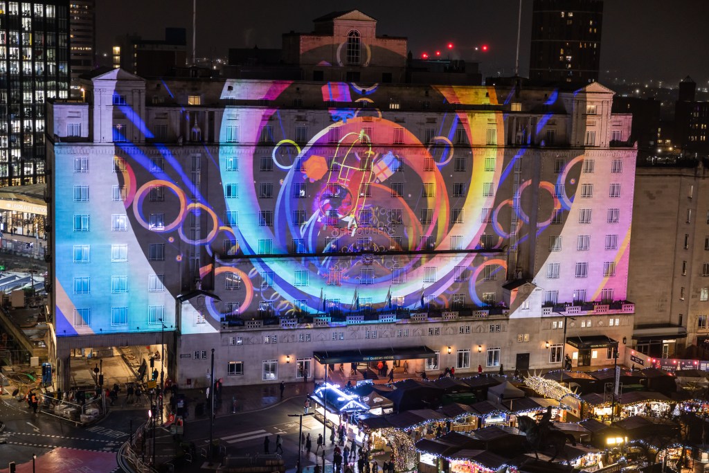 Sadly, I missed last year’s inaugural mega animation using Queen’s Hotel in City Square as a screen, so was excited to be at the launch of the 2024 version. The weather was drizzly but good enough for the gathered crowd to enjoy the spectacle in reasonable comfort, especially the people ambling round the Christmas market stalls, totally oblivious to what was to come, until the burst of light and blast of noise took their mind off what to buy Aunty Betty for Christmas.