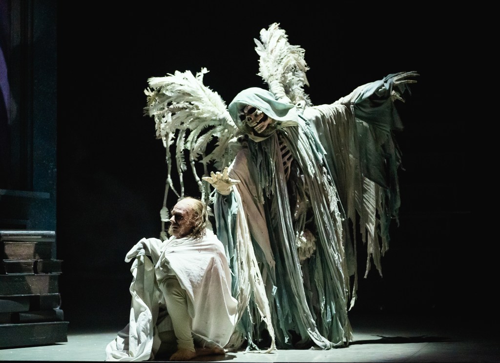 Act Three sees The Ghost of Christmas Yet To Come, lead Scrooge back to the Cratchits’, where they are grieving for the loss of Tiny Tim. He has a vision of three hags ransacking the bedroom of a corpse, disposing of his possessions and he realises that it is his chamber, which is also being visited by the Angel of Death. He throws himself at his bed, which has now become a coffin, complete with headstone bearing his name, and vows to change.