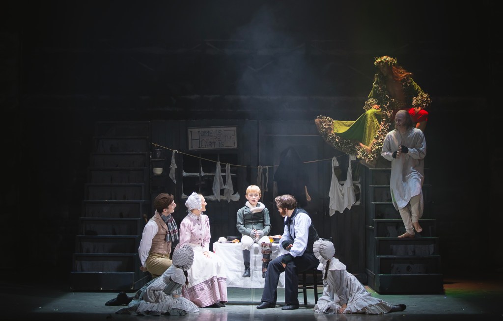 Scrooge with the Ghost of Christmas Present visit the Cratchit family where Tiny Tim, Leon Sumi-Cathcart, is telling stories. Mrs Cratchit was danced by Harriet Madden and the other children were Julie Nunès, Sean Kitano and Albert Gonzalez Orts.