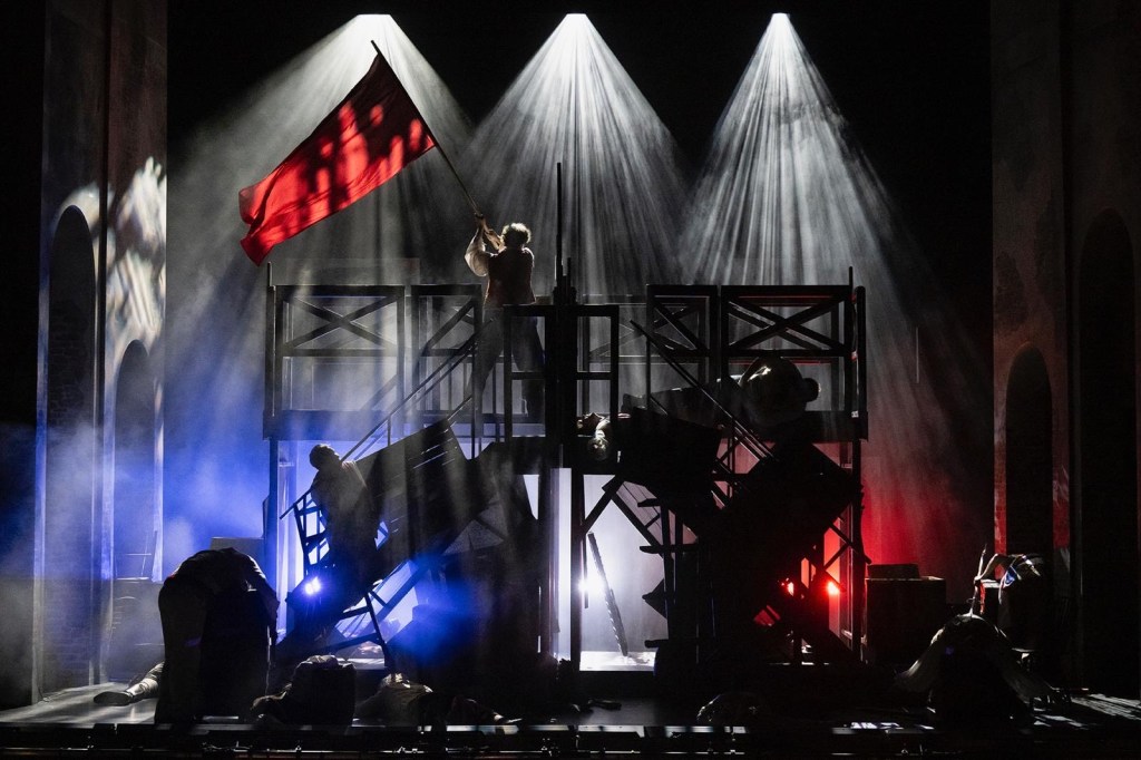 Gate house aside, the set was terrific, with a digital back wall providing a range of effects. The main physical features were a stone tower to the left of the stage and a bridge which was lowered from the flies when needed. It was this which provided the ‘wow’ moment of the whole piece when Javert threw himself from it into the Seine. The effect really was insane – come on – I’m not going to miss an open goal like that!