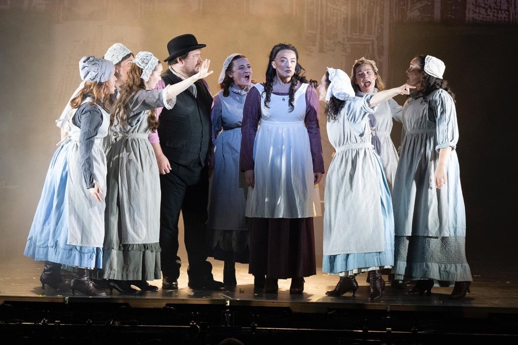 Helen Spencer as Madame Thénardier, Jason Weightman as Monsieur Thénardier and Renee Revell as Young Cosette
