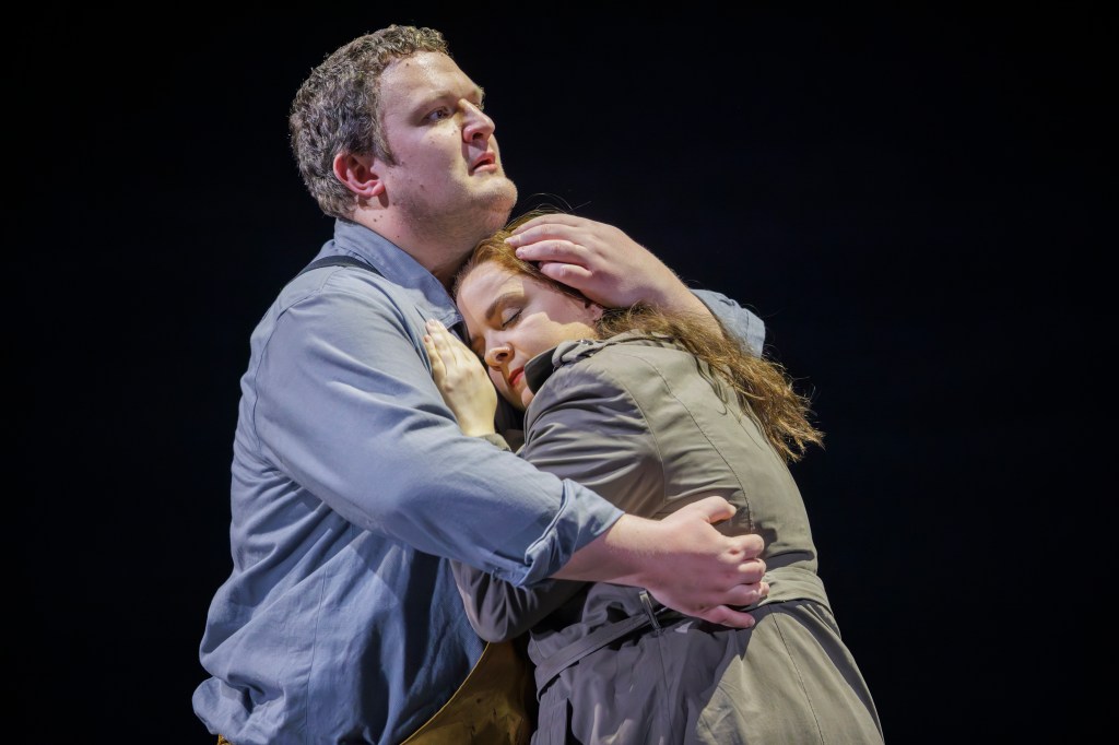 John Findon as Peter Grimes and Philippa Boyle as Ellen Orford, share a tender moment.