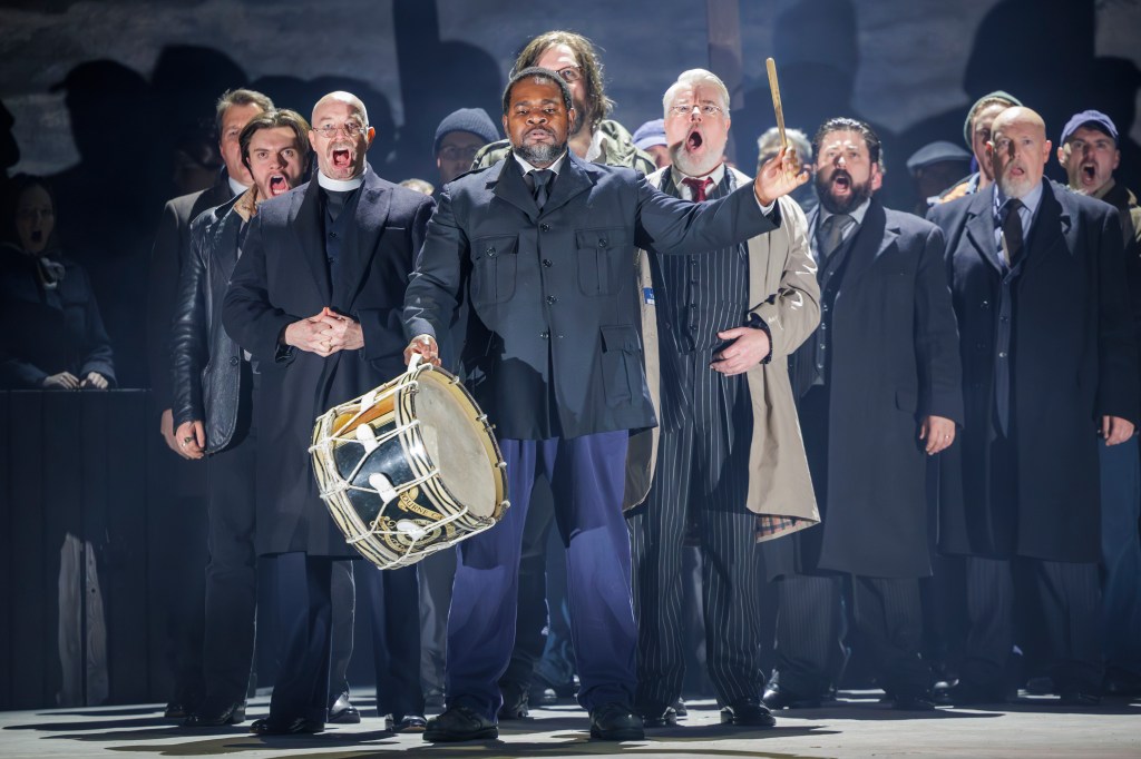 Johannes Moore as Ned Keene, Daniel Norman as Rev Horace Adams, Blaise Malaba, with drum, as Hobson and James Creswell as Swallow with members of the Chorus of Opera North