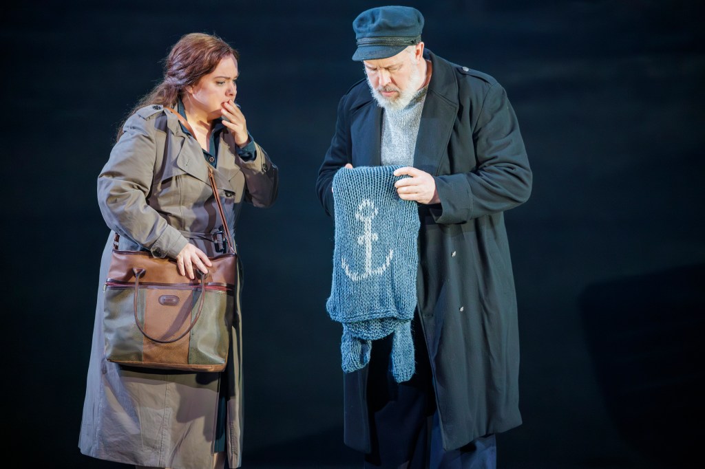 Philippa Boyle as Ellen Orford examines the sweater she knitted for John with Simon Bailey as Captain Balstrode.