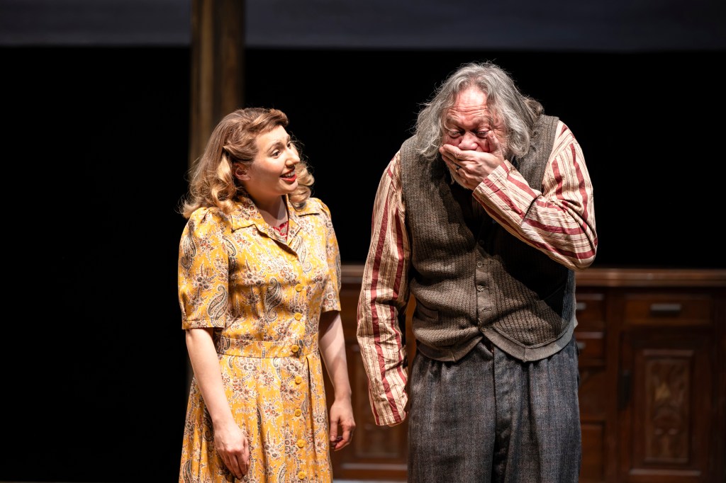 The set, by Simon Kenny who also designed the costumes, was superb with a revolving centre displaying Gilbert and Hortense’s small room on one side and the Bligh’s sitting room on the other. Although the latter was obviously furnished in the style of the time, I thought that what it was lacking was more important than what it contained. There was a radio but no TV, the significance of which I wonder whether registered with the younger audience members, i.e. those under fifty. In 1948 there were only 45,564 TV/Radio Licences issued, all in the London area, the Birmingham transmitter didn’t open until 1949. Even those who had a set could not use it between 1st September, 1939 and 7th June, 1946 as the BBC shut down as it was thought the powerful transmitter at Alexandra Palace would help with enemy navigation.